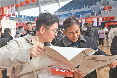 2月3日,求職者在江蘇省揚州市寶應縣新春大型人力資源招聘洽談會上尋找就業崗位。