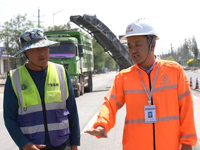 陳鵬(右)紮根工地建設一線。 吳忠市公路管理段 供圖