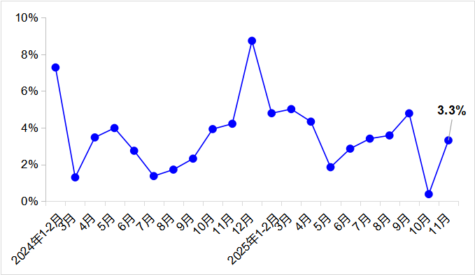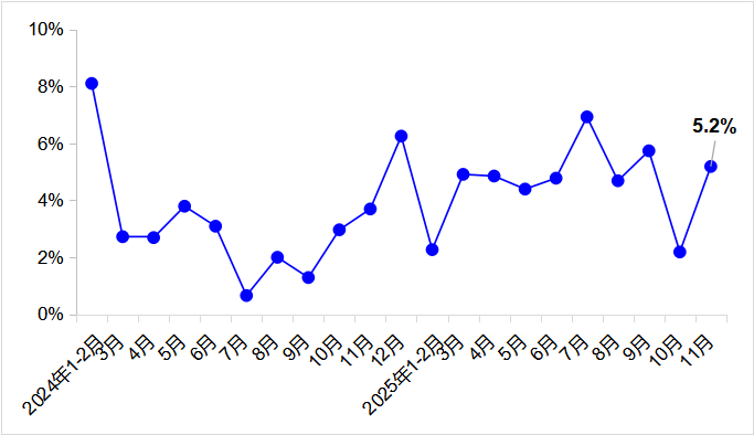 11月,完成營業性貨運量52.6億噸,同比增長3.3%。其中,完成公路貨運量38.8億噸,同比增長3.6%;完成水路貨運量9.2億噸,同比增長3.3%。