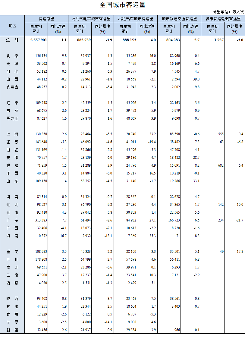 全國城市;客運量
