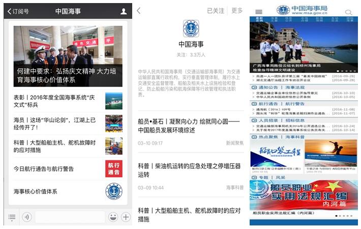 二是深化政務微信資訊公開。繼續優化海事新媒體平臺,充分發揮"中國海事"政務微信平臺資訊公開作用,逐步拓展公開內容範圍,目前已覆蓋最新政策、通知公告、重大新聞資訊、海事活動、各類專題、海事人物/故事、政策解讀、科普知識等內容。推動"中國海事"公眾號資訊入駐人民日報客戶端,整合資源、增強資訊透明度、提高服務品質,切實滿足社會公眾對於海事資訊公開的需求。截至2016年12月31日,中國海事微信公眾號總用戶數已超過45000人,全年用戶數量增長逾一倍。